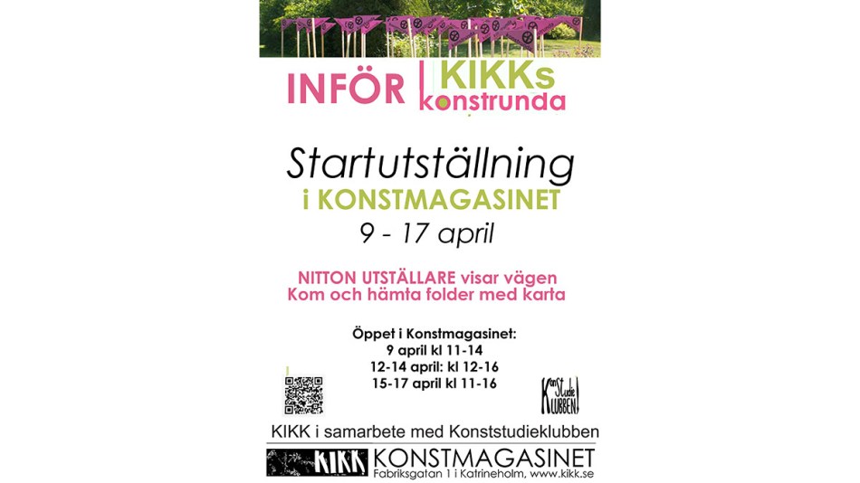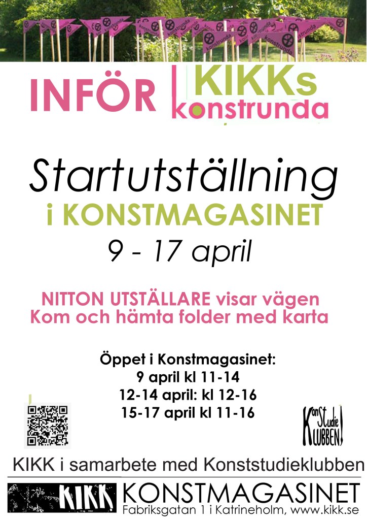 PÅ lördag 9/4 kl 11:00 öppnar startutställningen inför konstrundan i Konstmagasinet, utställningen pågår fram till 17/4. Alla årets 19 deltagare presenteras och visar ett konstverk.