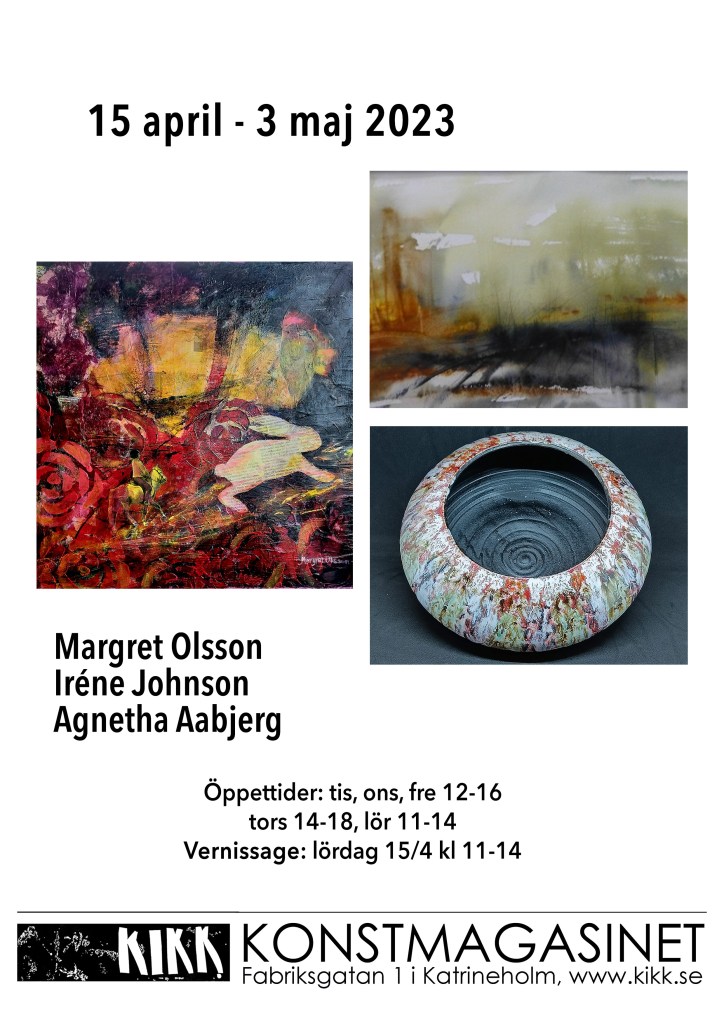 I år valdes 7 st nya medlemmar in i KIKK och fyra av dem presenterades med en gemensam utställning i mars. Nu är det dags för presentationsutställning nr2 i Konstmagasinet där Margret Olsson, Iréne Johnsson och Agnetha Aabjerg visar upp sina fantastiska konstverk.