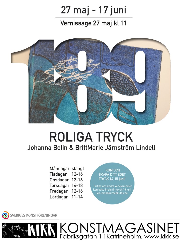 Under perioden 27/5 – 17/6 visar BrittMarie Järnström Lindell och Johanna Bolin resultat ev en konstnärlig idé som växt fram genom projektet Roliga tryck, ett skapande skolaprojekt för skolor i Katrineholms Kommun under verksamhetsåret 2022-23. Sammanlagt har ca 1550 elever tryckt plåtar och inför varje tillfälle har BrittMarie och Johanna också tillverkat en visningsplåt vilket resulterat i 189st tryckplåtar som nu tryckts och visas i utställningen.