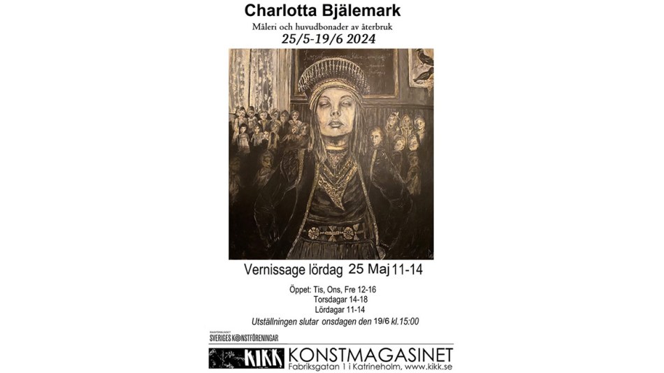 Vår nya KIKK-medlem Charlotta Bjälemark ställer ut målningar och huvudbonader av återbruk i Konstmagasinet. Utställningen pågår mellan 25 maj och 19 juni 2024.