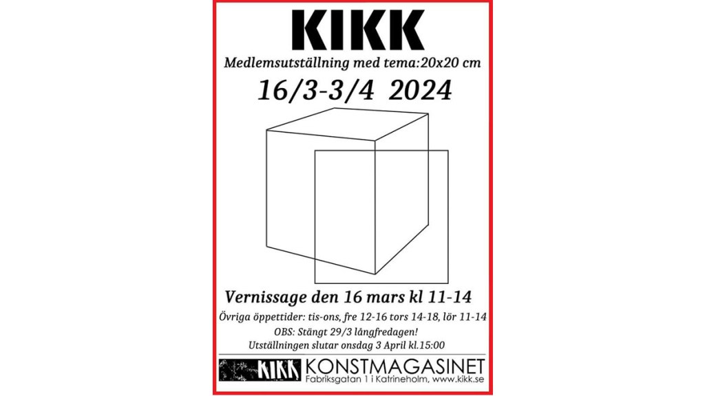 På lördag 16/3 2024 öppnas KIKKs medlemsutställning ”20×20” i Konstmagasinet, medlemskonstnärerna skapar målningar och skulpturer fritt inom måtten 20x20cm. MedverkandeFortsätt läsa