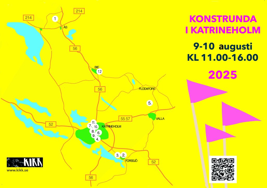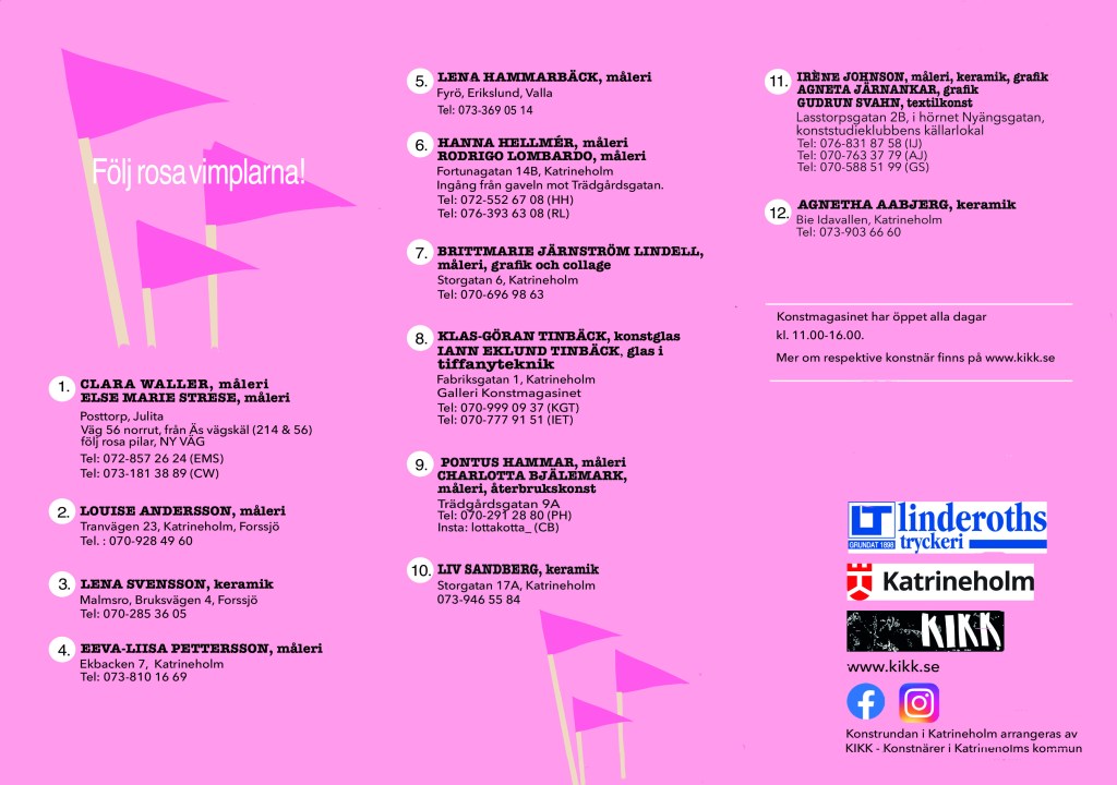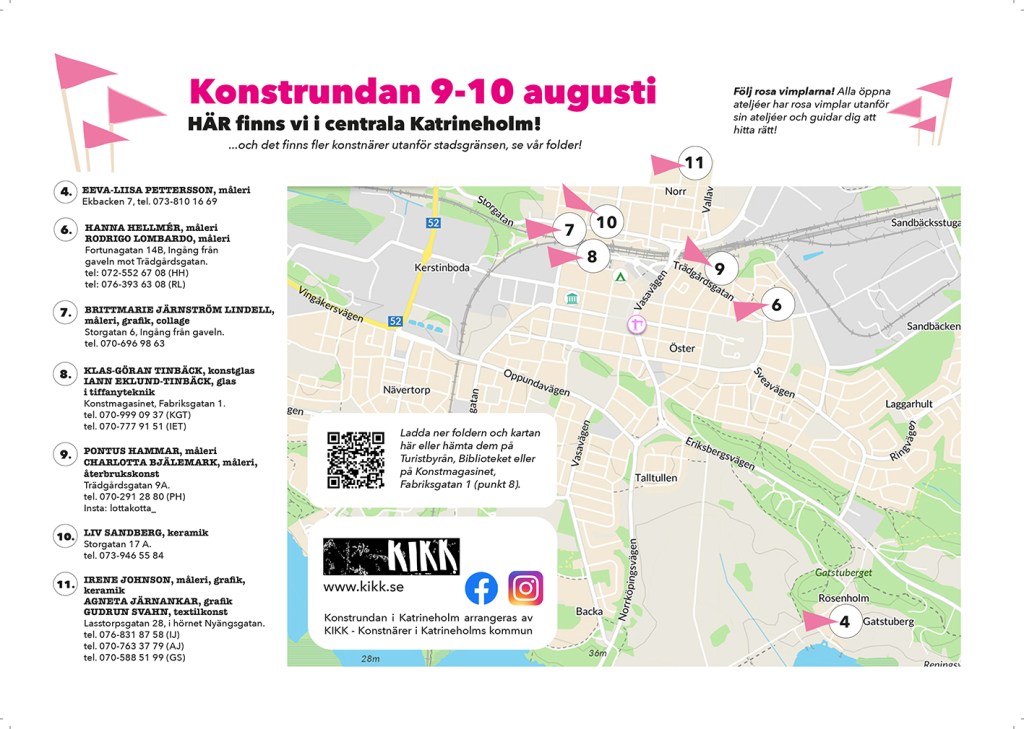 Folder med karta finns att hämta i Konstmagasinet, Fabriksgatan 1, Katrineholm. Observera att kartan endast är en ungefärlig hänvisning (se adressbeskrivningar under varje konstnär för mer exakt information). Foldern går också att ladda ner här: